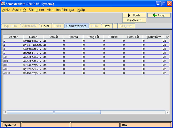 Semesterlistan skriver ut information om semesterberäkningar i affärssystemet SystemQ. Informationen hämtas från