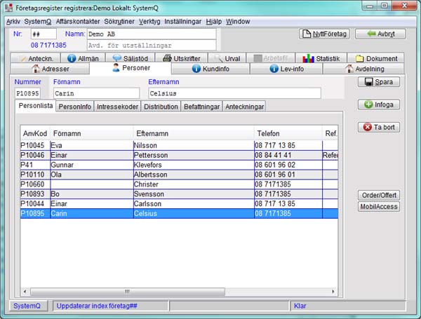 | Referens 1:a | Makera den person som skall fungers som referensperson när du registrerar kundorder. Denna person ersätter då Er referens i adress-fliken | ||||
