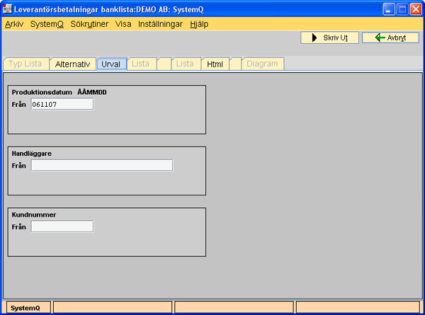 Beskrivning av rutin i Affärssystemet SystemQProgrammet skriver ut en lista över betalningar som är bokade till bankgirots leverantörsbetalningsservice. Denna utskrift avslutar utbetalningen, som sedan ej går att ändra. De ligger också till grund för utbetalningsjournalen. Betaldatum sätts till utskriftsdatum. Ange handläggare och kundnummer som skall skrivas ut på banklistan. | |||||
