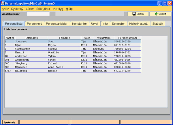 Beskrivning av rutin i Affärssystemet SystemQFör att köra löner måste man lägga upp vilka anställda som skall ha löner, olika variabler och konstanter. Personalen visas i listan. Denna kan sorteras genom att trycka på listans etiketter. Välj person med att dubbelklicka på raden. | |||||