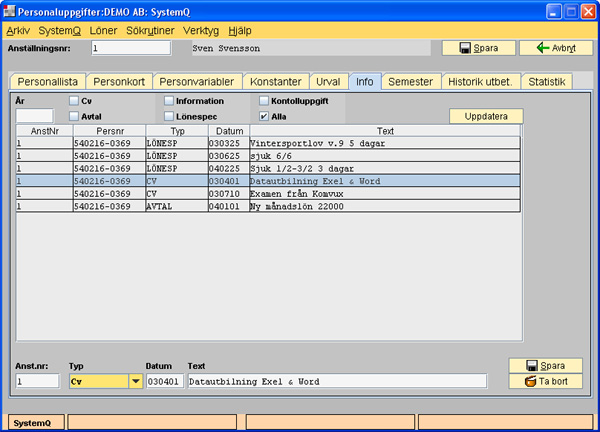 Beskrivning av rutin i Affärssystemet SystemQHär kan du samla information på den anställda. T.ex avtal om nya löner, utbildningar. När du lägger in text till lönespecifikationerna lagras dessa i samma tabell och visas här Markera vilken typ av information som du vill visa och tryck därefter på Uppdatera som visas raderna. | |||||