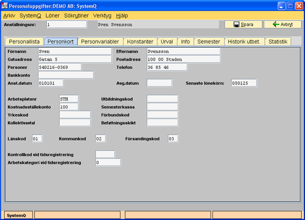Anställningsdatum och Avgångsdatum används för att hålla reda på anställd tid. Vid periodavslutning uppdateras "anställd tid" med hänsyn till ovanstående datum. Om anställningsdatum är blankt, kommer personen inte med i lönekörningarna. Är nytt anställningsdatum registrerat vid återanställning kommer systemet att tar bort avgångsdatumet vid nästa lönekörning. | ||||||||||||||||||||||||||||||||||||||||||||||