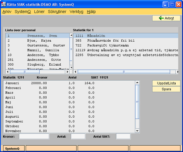 Beskrivning av rutin i Affärssystemet SystemQVid avsluta löneperiod lagras SIAK-statistik i kronor och antal per SIAK-kod. Här kan du rätta denna statistik. Även löneraden för fackavgifter i % som systemet själv konstruerar ger upphov till denna statistik. Statistiken ligger till grund för många rapporter och det är därför viktigt att den stämmer. Dubbelklicka på den anställde du vill arbeta med. Du få då upp de SIAK-koder som finns registrerade på den anställde. Dubbelklicka på den SIAK-kod du vill ändra på och du får upp månad för månad av statistik. Dubbelklicka på den rad du vill ändra på för att få upp beloppen i editeringsfälten. Tryck på Spara när du är klar. Under menyvalet Verktyg finner du Ändra SIAK på alla. Här kan du överföra all statistik på en kod till en annan. Observera att överföringen sker för samtliga personer i lönesystemet och att den nya koden måste vara upplagd i SIAK-registret. | |||||