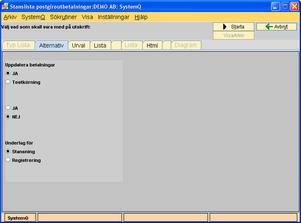Beskrivning av rutin i Affärssystemet SystemQDenna utskrift avslutar utbetalningen, som sedan ej går att ändra. De ligger också till grund för utbetalningsjournalen. Betaldatum sätts till utskriftsdatum. Postgirot erbjuder fakturabetalningsservice som innebär att man kan skicka in ett stansunderlag till postgirot istället för avier och betalningsorder. Postgirot bevakar och betalar på förfallodagen som är angiven på listan. Programmet ger ett stansunderlag som är anpassat till postgirots krav. Fördelen är att betalningarna kan skickas i förväg utan att förlora räntedagar. Fyll i formuläret, kundnummer får du från postgirot. Prod.nr och användarkod fyller du i med valfri information. Endast leverantörer med postgironummer kommer med på listan. I utbetalningsjournalen kommer endast de som har förfallodag <= dagens datum med, d.v.s. bokföring av betalningarna kommer att ske när dessa är verkställda. | |||||