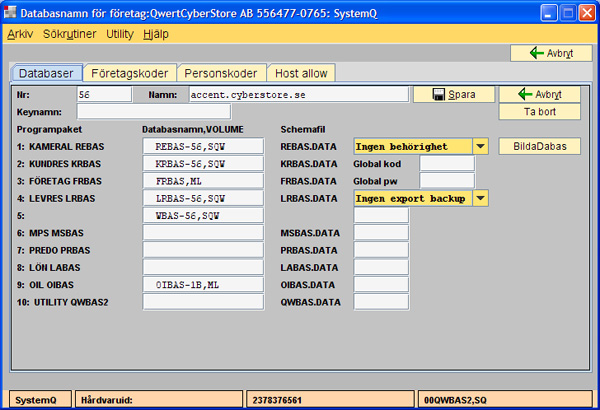 FRBAS och OIBAS-1B är gemensamma med affärsystmets databaser WBAS-56 hanterar informationen och utseende av hemsidan REBAS-56,KRBAS-56 och LRBAS-56 är dummydatabser men bör finnas med för att vi skall kunna anropa vissa program | |||||||||||||||||||||||||||||||||||